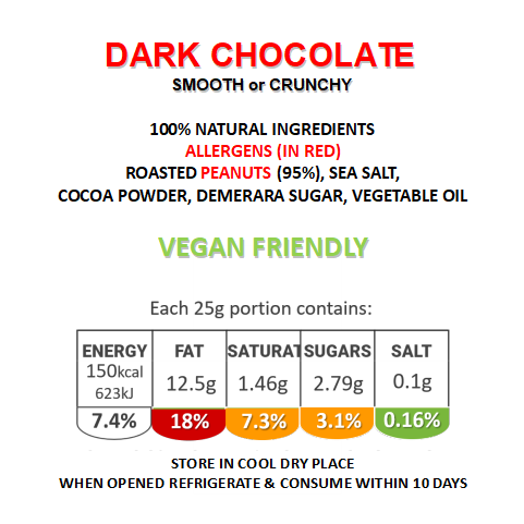 Made with 100% natural ingredients, and suitable for Vegan and Vegetarian diets, all our Peanut Butters contain Roasted Peanuts, Salt and Vegetable Oil (Allergens in RED)